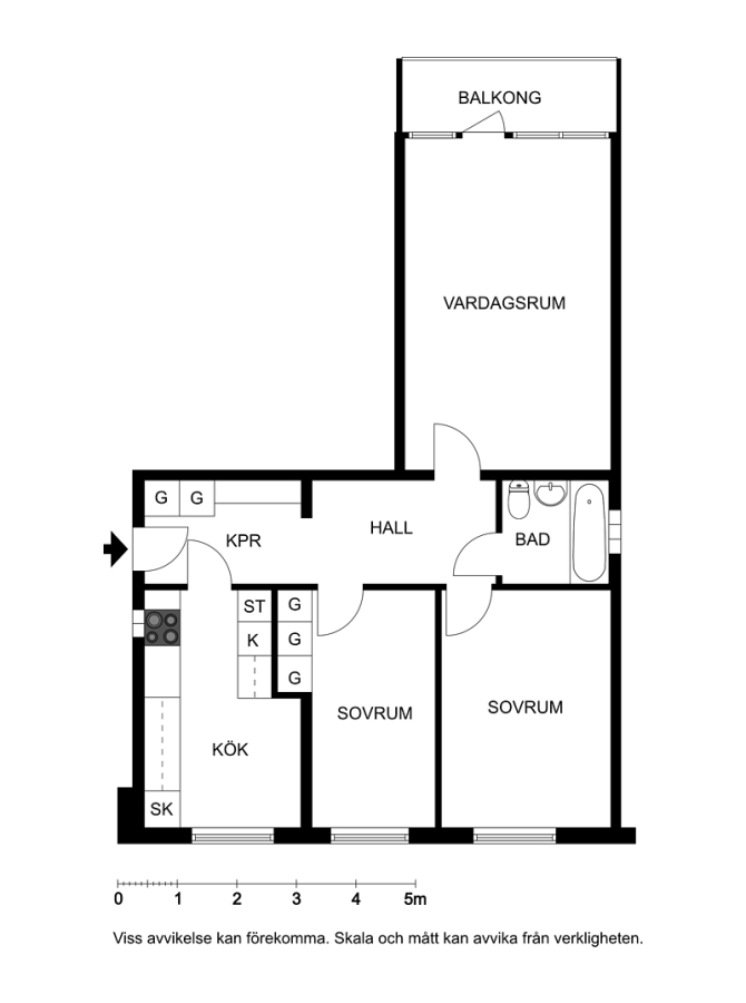 Vardagsrummet är rymligt och lämnar plats för såväl matplats som soffgrupp. Här har du stora fönsterpartier som släpper in gott om ljus till bostaden samt utgången till balkongen. Utöver detta har du även två större sovrum med plats för säng och övrigt möblemang.