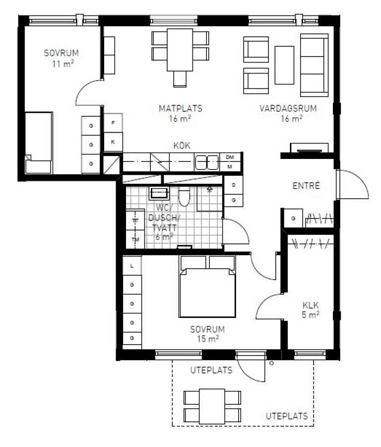 Lägenheten erbjuder en effektiv och öppen planlösning som skapar en luftig och social känsla mellan kök och vardagsrum. De vitmålade, släta väggarna tillsammans med genomgående ekparkett ger ett stilrent och enhetligt intryck. Köket kommer från Marbodal och är både rymligt och funktionellt, utrustat med moderna rostfria vitvaror. Det stora, ljusa badrummet är utrustat med dusch, tvättmaskin och torktumlare. Som en extra fördel har lägenheten en egen uteplats – perfekt för avkoppling, sociala stunder eller en lugn stund utomhus.