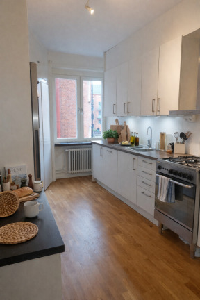 Lägenheten har en genomtänkt planlösning med gott om plats för både vardag och umgänge. Köket är funktionellt och stilrent med vita luckor samt utrustat med hel kyl och frys, gasspis, fläkt och diskmaskin. Badrummet är praktiskt utformat och inrett med dusch, toalett, handfat och tvättmaskin. I vardagsrummet och ett av sovrummen ligger nyare parkettgolv, medan det större sovrummet och hallen pryds av vacker fiskbensparkett som ger bostaden extra karaktär. Samtliga väggar är målade i vitt och bidrar till ett ljust och harmoniskt intryck.