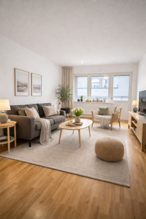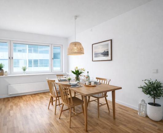 Lägenheten erbjuder en välplanerad och genomgående planlösning med fint ljusinsläpp från två håll. I hallen möts du av klinkergolv vid entrén som övergår i parkett – ett stilrent och praktiskt val som sedan fortsätter genom resten av bostaden och skapar en enhetlig känsla.