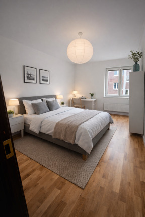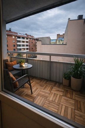 Vardagsrummet är rymligt och har utgång till en generös balkong mot den stora innergården – perfekt för avkoppling. Sovrummen är belägna mot gatan och erbjuder bra möbleringsmöjligheter. Förvaringen är väl tillgodosedd tack vare en rymlig klädkammare.