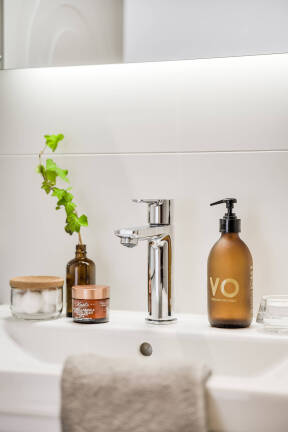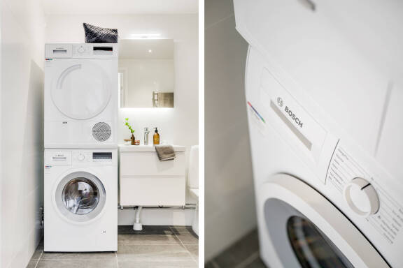 Badrummet är helkaklat och modernt med dusch, tvättmaskin och torktumlare. Dessutom finns en separat gästtoalett – en uppskattad detalj som underlättar i vardagen och vid besök. I hallen finns även en praktisk klädkammare och garderober som ger gott om förvaring. Genomgående parkettgolv bidrar till en varm och ombonad känsla i hela lägenheten.