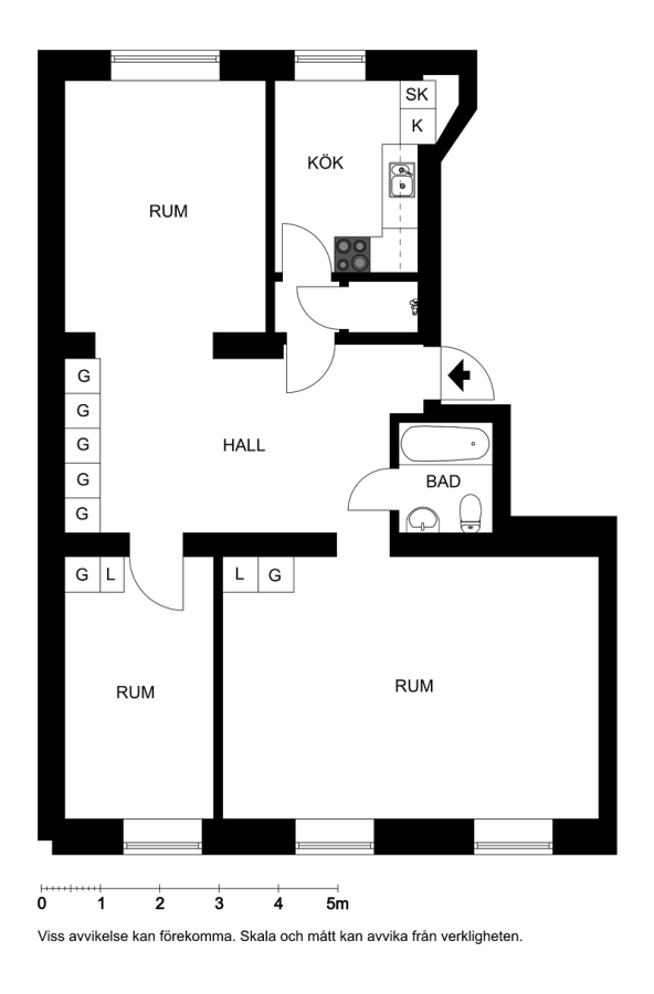 Låt dig välkomnas av en generös hall med gott om plats för förvaring. Till vänster om hallan ligger det rymliga badrummet som har mörkt klinkergolv och vitkaklade väggar. Här har du wc, tvättställ, spegelskåp, badkar. Vidare når du till köket som är utformat med generösa arbetsytor och gott om köksskåp för förvaring. Köksluckorna är röda och utrustning bestående av ugn, spis och kyl/frys. Kökets stora ytor tillåter lämnar plats åt ett mindre matbord. På golvet ligger en praktisk plasmatta och väggarna är vitmålade.