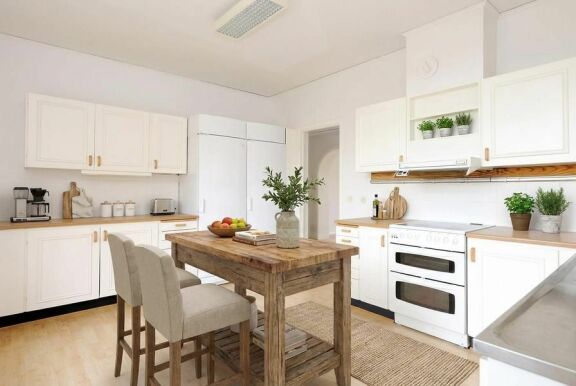 Det rymliga köket erbjuder gott om plats för matgrupp och har ett stort skafferi som ger extra förvaring. Här finns alla förutsättningar för både vardagsmiddagar och sociala tillställningar.