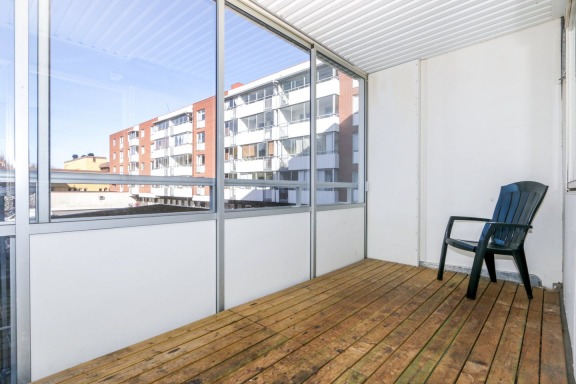 Lägenheten har en välplanerad planlösning med tre rum och kök samt en inglasad balkong som förlänger bostaden och kan nyttjas stora delar av året. Ett hem som passar utmärkt för såväl par som mindre familjer eller dig som vill ha extra utrymme för arbete eller gäster.