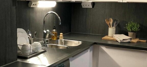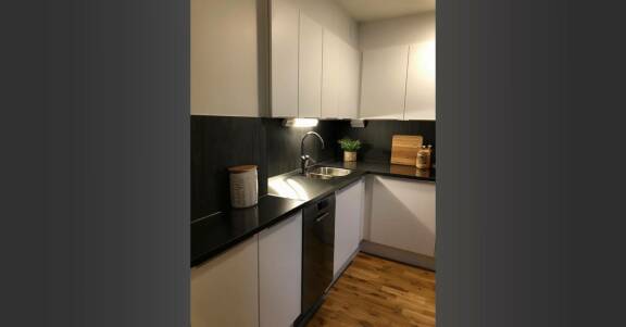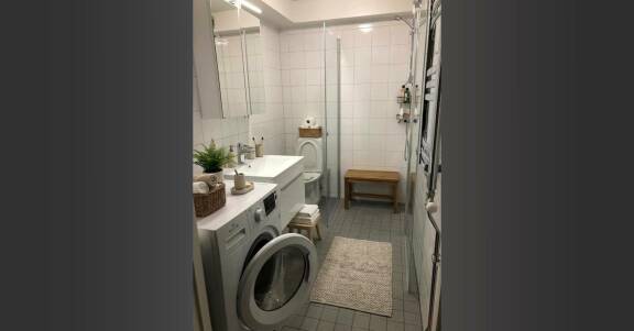 Köket är utrustat med diskmaskin, dubbla enheter för kyl och frys samt spishäll med integrerad varmluftugn. Badrummet är kaklat och försett med duschväggar. Kombimaskin ingår i hyran. Ett källarförråd tillhör lägenheten.