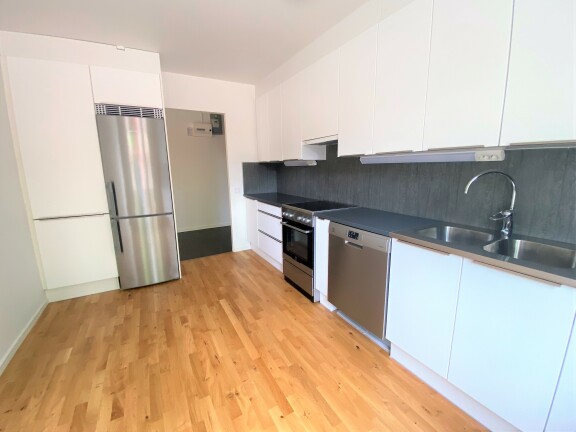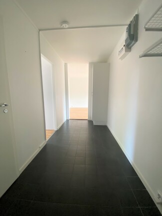 I hallen möts du av ett nytt svart klinkergolv som övergår i ett genomgående ekgolv i resten av bostaden. Vitmålade väggar skapar en ljus och välkomnande atmosfär. Badrummet är helrenoverat i svart och vitt med klinkergolv, kaklade väggar, golvvärme, infällda spotlights, glasade duschväggar och tvättpelare. Köket är modernt inrett med vita luckor, silverfärgade handtag, svart bänkskiva, rostfria vitvaror och diskmaskin.