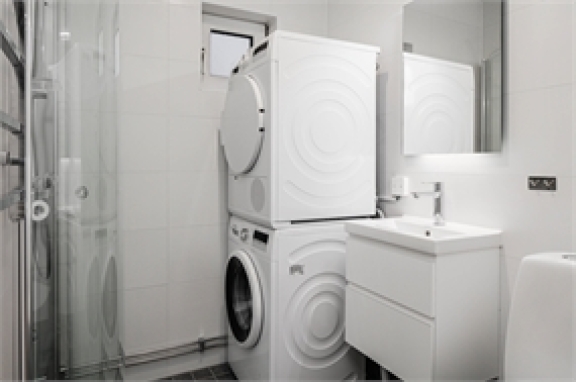 Det helkaklade badrummet håller en hög standard och är utrustat med både tvättmaskin och torktumlare för en smidig vardag.