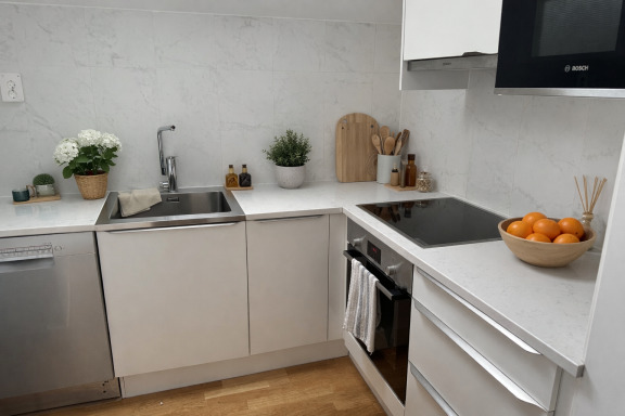 - Nytt kök med rostfria vitvaror och bänkskiva i vit sten