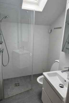 - Helkaklat badrum med golvvärme, spotlights och glasade duschväggar