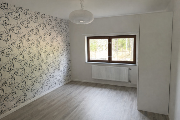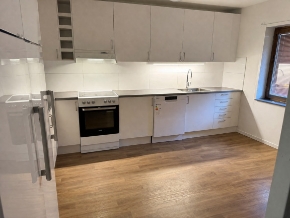 Köket är nyligen renoverat och utrustat med diskmaskin, vilket gör vardagen både smidig och praktisk. Här finns gott om plats för matlagning och gemensamma måltider.