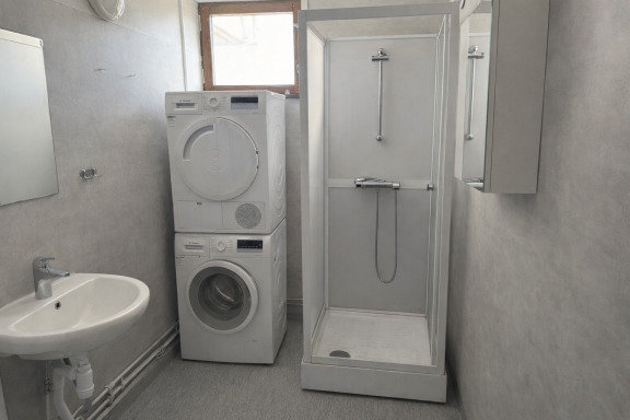 Bostaden har två badrum, vilket är perfekt för en större familj eller ett hushåll med flera personer. I det ena badrummet finns en installerad tvättpelare som gör tvätt och vardagssysslor enklare att hantera.