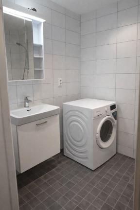 Det moderna köket från Marbodal har vita luckor och är utrustat med diskmaskin, kyl och frys samt ugn och spis med keramikhäll. Här finns allt du behöver för en smidig vardag. Badrummet är helkaklat med klinkergolv, handdukstork och duschhörna med glasväggar. För extra bekvämlighet ingår även egen tvättutrustning i bostaden.