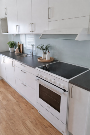 Det stilrena köket från Marbodal är utrustat med vita luckor samt diskmaskin, kyl och frys, ugn och spis med keramikhäll – perfekt för både vardag och helg.