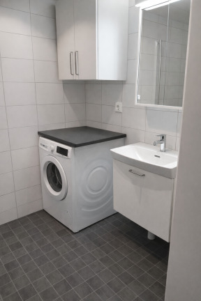 Köket är ljust och modernt från Marbodal, med utrustning som diskmaskin, kyl och frys samt ugn och spis med keramikhäll. Här finns goda förutsättningar för både vardagsmatlagning och trevliga middagar. Badrummet är helkaklat och inrett med klinkergolv, handdukstork och duschhörna med glasade väggar. För extra bekvämlighet ingår även egen tvättutrustning i bostaden.