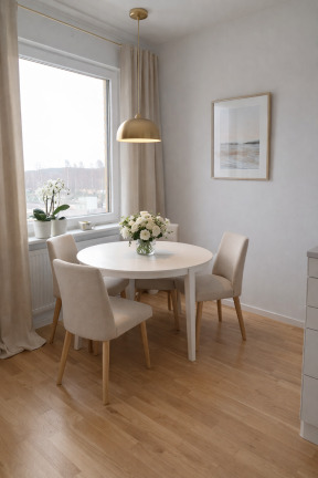 Lägenheten är helrenoverad och erbjuder ett stilrent kök från HTH med vita luckor och moderna vitvaror, inklusive diskmaskin, mikrovågsugn samt spis med induktionshäll och varmluftsugn. Det helkaklade badrummet är utrustat med klinkergolv, golvvärme, dusch, handdukstork, kommod och nytt porslin – allt utformat för hög komfort i vardagen. Från bostaden nås en balkong i österläge, perfekt för att njuta av morgonsolen.