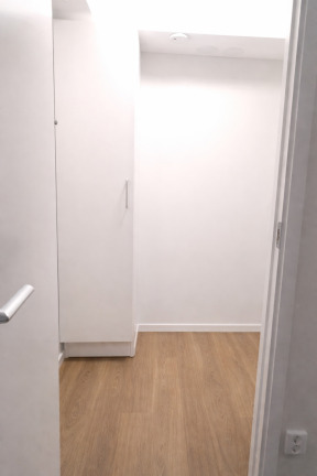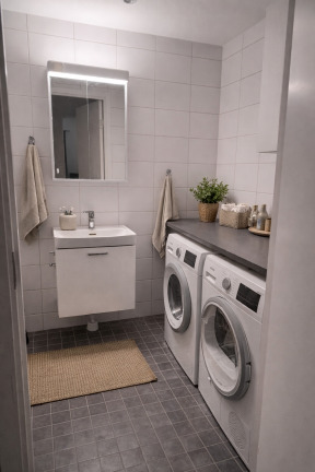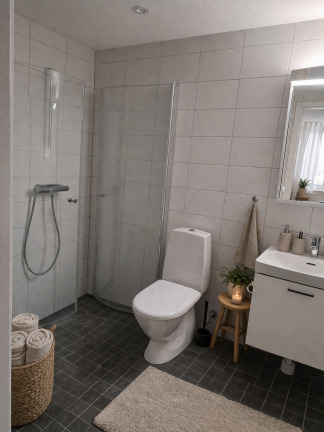 Badrummet är helkaklat med klinkergolv och utrustat med handdukstork samt duschhörna med glasväggar. För extra bekvämlighet finns egen tvättutrustning i lägenheten.