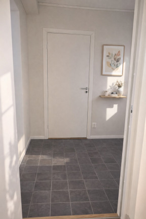 Redan i entrén möts du av en öppen och inbjudande planlösning med klinkergolv som övergår i vacker ekparkett från Kährs. Väggarna är målade i en ljusgrå ton som skapar en harmonisk och tidlös känsla i hela hemmet.