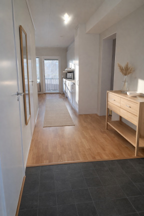 I entrén möts du av en öppen och inbjudande känsla med klinkergolv och ljusgrå väggar. Ekparkett från Kährs löper vidare genom bostaden och binder samman rummen.