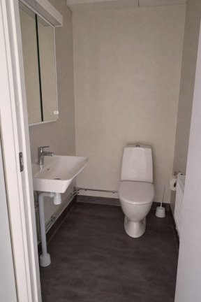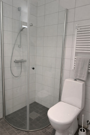 Badrummet är helkaklat och utrustat med klinkergolv, handdukstork och en modern duschhörna med glasväggar. Egen tvättutrustning ingår och gör vardagen både enklare och mer bekväm.