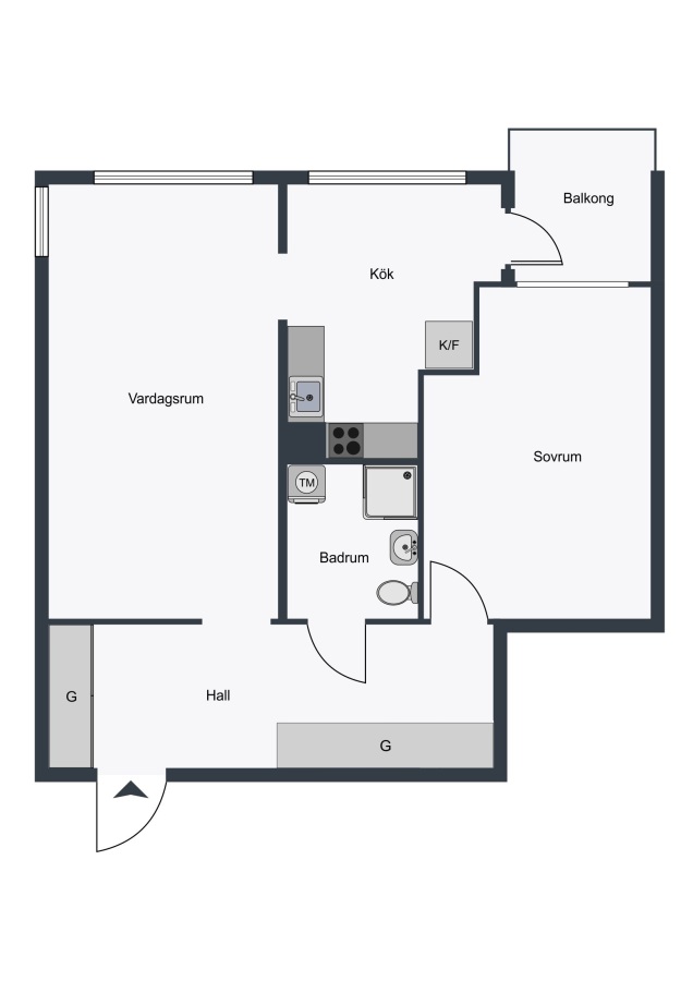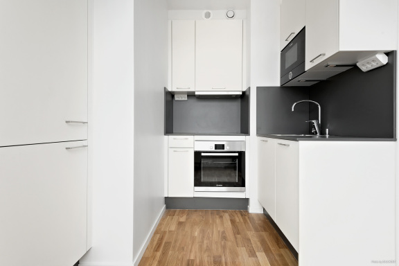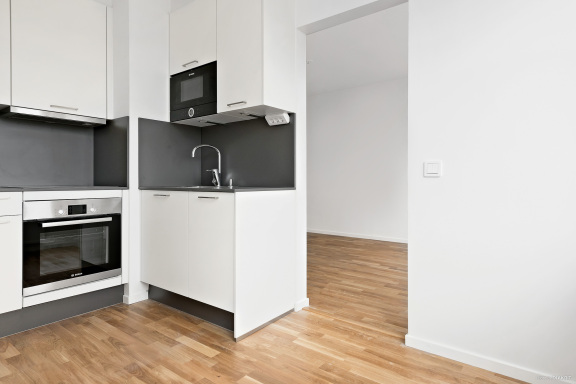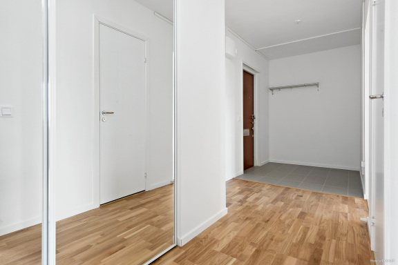 Lägenheten har en inbjudande hall med bra förvaringsmöjligheter i skjutdörrsgarderober. Den stilrena kokvrån i vitt är utrustad med moderna vitvaror såsom inbyggd mikro, ugn och diskmaskin. Från kokvrån finns utgång till den trivsamma balkongen – en idealisk plats för morgonkaffet eller en stunds avkoppling utomhus.