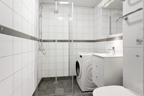 Badrummet är helkaklat i grått och vitt och utrustat med kombinerad tvättmaskin och torktumlare för extra bekvämlighet. Genomgående ljusa väggar och vackra parkettgolv ger ett fräscht och enhetligt intryck i hela lägenheten.