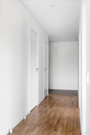 I hallen möts du av klinkergolv innanför ytterdörren och vidare in i bostaden ligger parkettgolv tillsammans med vitmålade väggar som skapar en ljus och enhetlig känsla.