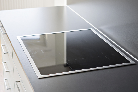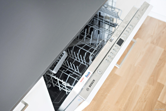 - Kök med vita luckor och grå bänkskiva, diskmaskin, mikrovågsugn, inbyggnadsugn och häll samt två stycken inbyggda kyl/frys.