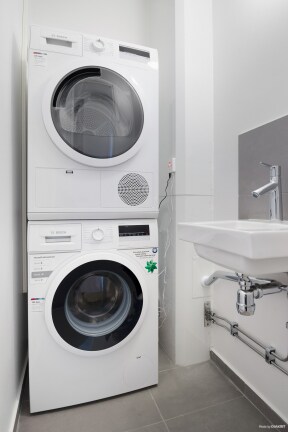 - Tvättrum med tvättmaskin och torktumlare i pelare.