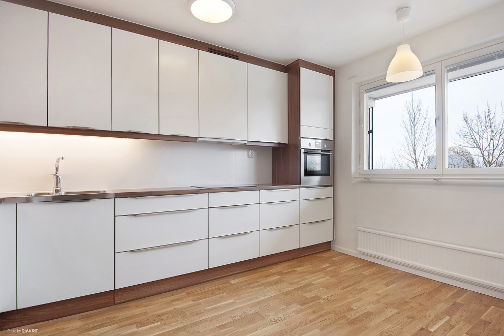 Köket är utrustat med spis med varmluftsugn, glaskeramikhäll samt fullstor kyl och fullstor frys. Här finns goda arbetsytor och plats för matbord, och den direkt anslutna balkongen blir ett uppskattat extrautrymme under årets varmare månader.
