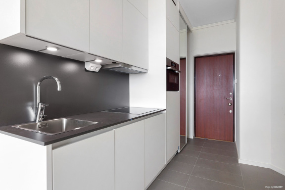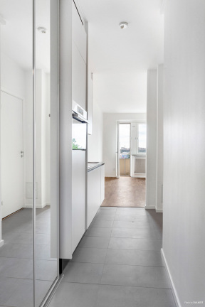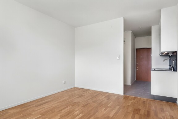 Bostaden har ett ljust och funktionellt allrum med plats för både säng, mindre soffgrupp och matplats. De ljusa ytskikten tillsammans med parkettgolv skapar en modern och trivsam atmosfär, samtidigt som planlösningen gör att varje kvadratmeter utnyttjas på ett smart sätt. Från rummet nås även lägenhetens balkong som ger ett trevligt extra utrymme för avkoppling.