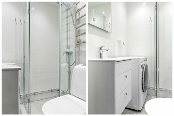 Badrummet är modernt och helkaklat med dusch samt kombinerad tvättmaskin och torktumlare, vilket ger extra bekvämlighet i vardagen.