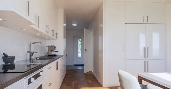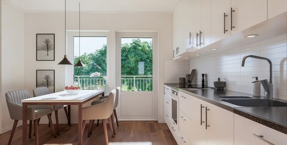 Väggarna är målade i ljus nyans och golvet kläs i fin ekparkett. Lägenheterna har stilrent kök från Marbodal. Vitvaror som diskmaskin, kyl och frys samt ugn och spis med keramikhäll.