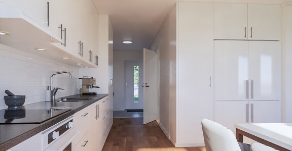 När du kliver in möts du av en luftig entré med klinkergolv och goda förvaringsmöjligheter i både garderob och separat förråd. Väggarna är målade i en ljus och neutral ton och det genomgående golvet är vacker ekparkett.