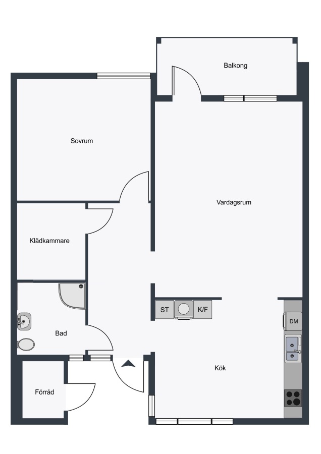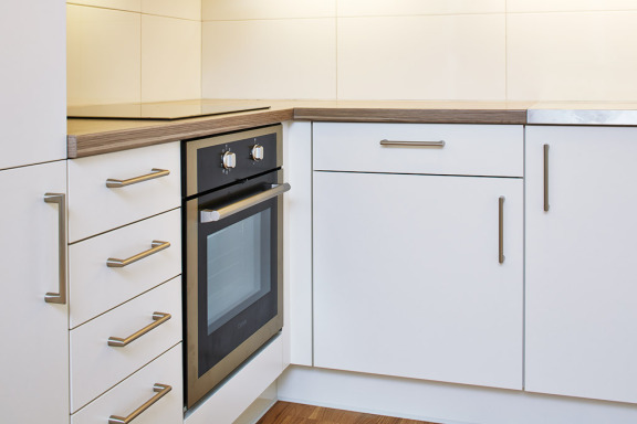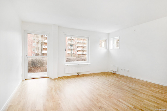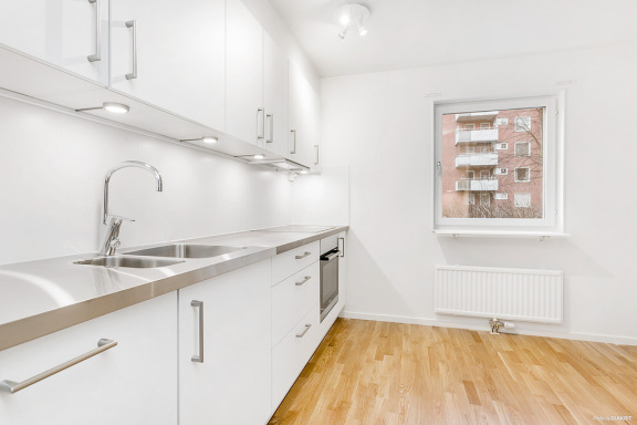 Lägenheten har ett luftigt vardagsrum med fint ljusinsläpp och utgång till uteplats eller balkong. Det moderna köket är helrenoverat med vita skåpluckor, bänkskiva i neutralt utförande och full maskinell utrustning, inklusive diskmaskin, spishäll, inbyggnadsugn samt dubbel kyl/frys.