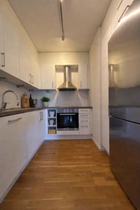 Lägenheten är belägen på andra våningen i fastighet med hiss och säkerhetsdörr. De ljusa väggarna tillsammans med parkettgolv i bostadsrum skapar en modern och inbjudande känsla, medan hallen är praktiskt utrustad med stilren grå klinker. Det smakfulla köket erbjuder vita luckor, spishäll, diskmaskin och rostfria vitvaror, vilket gör det väl anpassat för både vardag och sociala tillfällen.