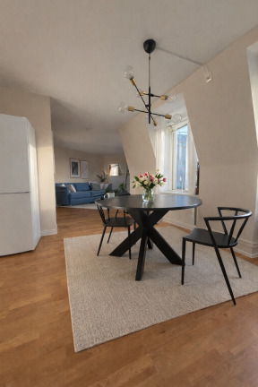 Bostaden erbjuder en genomgående ljus och enhetlig känsla med parkettgolv och ljusa väggar i samtliga rum. Läget högst upp i huset ger ett fint ljusinsläpp och en härlig rymd, och självklart finns hiss för bekväm access.