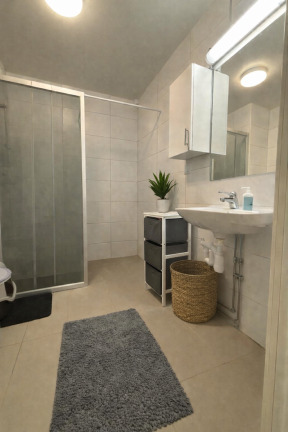 Det helkaklade badrummet är utrustat med fast duschvägg i glas och handdukstork, och är förberett för tvättpelare – en praktisk lösning för dig som vill ha egen tvättmöjlighet.