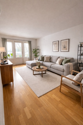 Vardagsrummet är ljust och luftigt med utgång till balkong i söderläge, vilket ger fint ljus större delen av dagen.