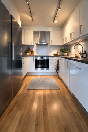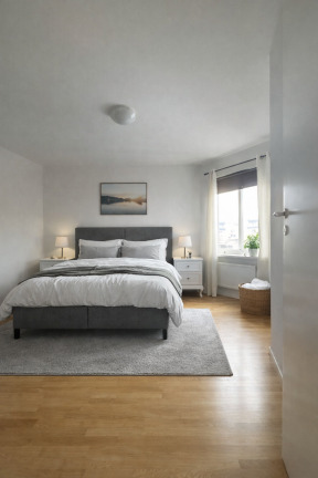 Lägenheten erbjuder en smart planlösning med generösa sällskapsytor och två rogivande sovrum. De ljusa väggarna i kombination med enhetliga parkettgolv skapar en modern och trivsam känsla genom hela hemmet.