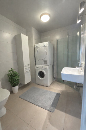 Det helkaklade badrummet är fräscht och utrustat med dusch samt tvättpelare, vilket ger extra komfort och praktiska lösningar i hemmet.
