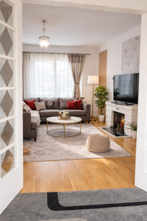 Det stora vardagsrummet är bostadens hjärta, med vackra ytor och en öppen spis som bidrar till karaktär och charm, även om den inte är eldningsbar. Från vardagsrummet nås den andra, generösa balkongen i västerläge, perfekt för eftermiddags- och kvällssol.