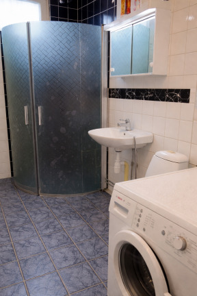 Badrummet är helkaklat och utrustat med dusch och tvättmaskin.