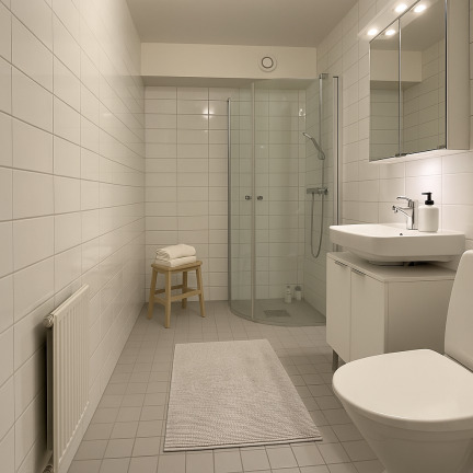Här möts du av en ljus och fräsch bostad med genomgående moderna ytskikt och bekvämligheter som gör vardagen enkel och trivsam.