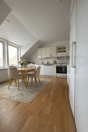 Lägenheten är belägen på våning 5 och erbjuder en harmonisk atmosfär med genomgående parkettgolv och vitmålade väggar som skapar en ljus och modern känsla.