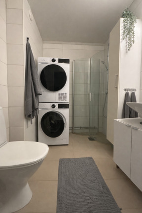 Badrummet är helkaklat och utrustat med duschväggar samt tvättpelare (2025) för extra bekvämlighet.
