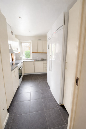 Köket är inrett i vitt och utrustat med spis med häll, och diskmaskin kommer att installeras.