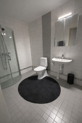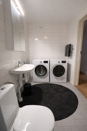 Här finns gott om plats för matbord och stolar, vilket gör köket till en naturlig samlingspunkt. Badrummet är helkaklat och modernt utformat med dusch och egen tvättpelare.