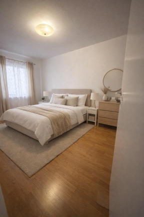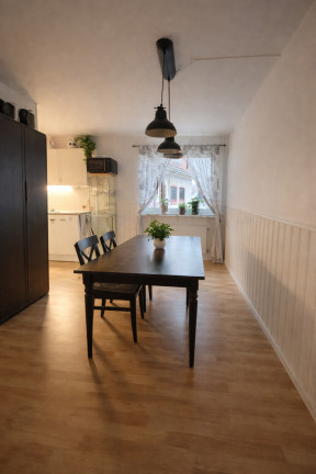 Lägenheten har en enhetlig och modern känsla med vitmålade väggar samt en kombination av laminat- och parkettgolv. Den rymliga hallen erbjuder mycket bra förvaring tack vare praktisk klädkammare.