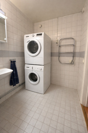 Badrummet är helkaklat och utrustat med badkar, handdukstork och spegelskåp. Här finns även både tvättmaskin och torktumlare för extra bekvämlighet.